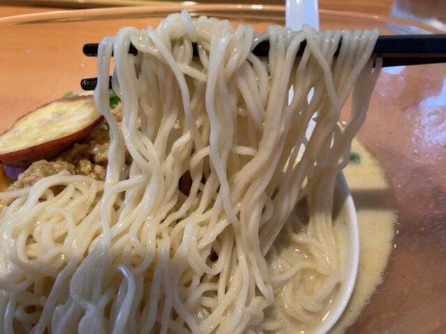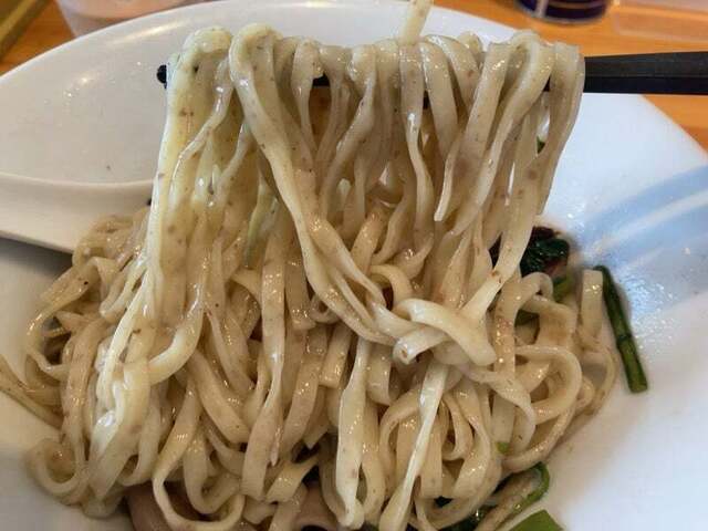 北海道産『春よ恋』と香川県産『さぬきの夢』をブレンドしたという低加水率の自家製ストレート細麺は、小麦の風味豊かで、しなやかなコシにボソシコ食感がなんとも心地よく、低加水率やから担担スープと絡みに絡んで、めっちゃ旨くてハンパな~い!