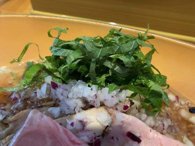しばらくして、生秋刀魚を焼いて煮込んで攪拌させ、そこに秋刀魚節+ポルチーニ茸+日高昆布のスープを加えた、"飲む“秋刀魚スープの上に、炙り秋刀魚、綺麗なピンク色した豚ロースレアチャーシュー、紫タマネギ、刻み青ネギがトッピングされた『【焼】秋刀魚らぁ麺』が、秋刀魚のなんとも香ばしい薫りを漂わせてやってきました。