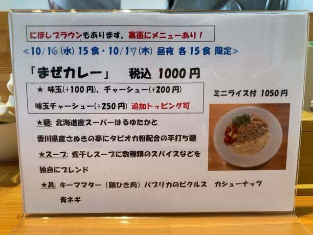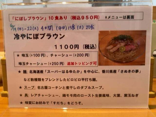 店前に貼られたメニューを確認すると、4日間限定ヒンヤリンコで冷たいのん!第2弾!は、『冷やにぼブラウン』でございます。