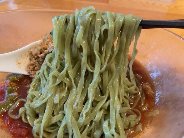 そして、見た目だけでめっちゃ食べたかったほうれん草パウダーとタピオカ粉を練り込んだ自家製中太平打ち麺は、小麦の風味豊かで、冷水でしっかり締められているからコシの強さがハンパなく、タピオカ粉が練りこまれててプリップリの食感と麺肌滑らかでツルツルッとした喉ごしの良さがなんとも心地よく、ほうれん草パウダーの大人でビターな風味も加わり、ヒンヤリンコなトマトスープとなじみになじんで、めっちゃ旨くてハンパな~い!