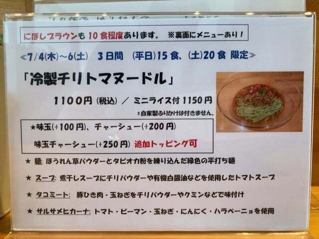 そして女将さんに《7/4(木)~6(土) 3日間限定 (平日)15食、(土)20食》『冷製チリトマヌードル ミニライス付(1,150円)』×2を、“味玉(100円)”とともに注文しました。