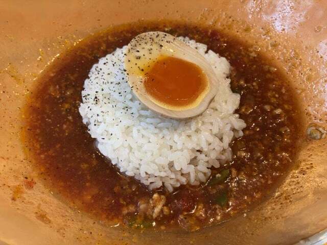 さっそく一口いただくと極上担担スープの風味と旨みをたっぷりと纏ったライスに、肉の旨みと甘み、マイルドな黄身のコク、上品なふりかけの風味と酸味、ブラックペッパーの風味が素敵なハ~モニ~を奏でて、これはもう旨すぎるっ!
