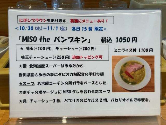 そして女将さんに《10/23(木)~25(土) (平日)15食、(土)20食》『【焼】秋刀魚らぁ麺(1,200円)』×2を、“味玉(100円)”と“白ごはん並(150円)×2”とともに注文しました。