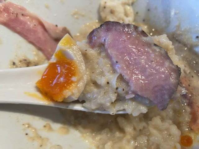 さっそく一口いただくと、ヒンヤリンコな白醤油スープの風味と旨みをたっぷりと纏ったライスに、マイルドな黄身のコク、ブラックペッパーの風味が加わって、これはもう旨すぎるっ!