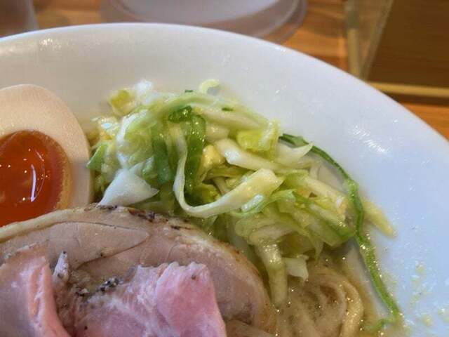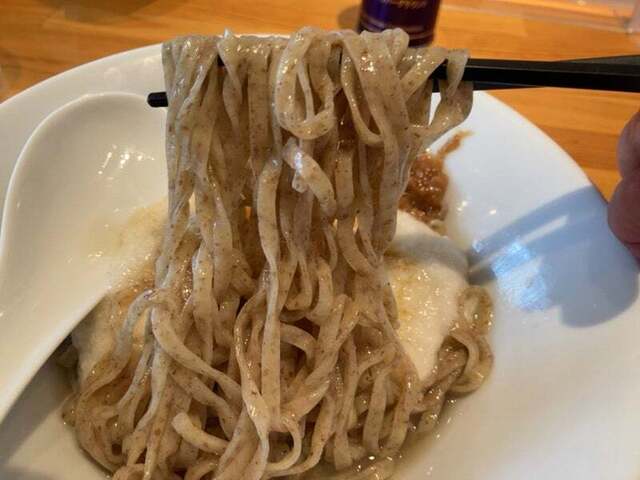 こちらも『初めてでは?』と思う、「京小麦プレミアム」と「さぬきの夢」を使用した低加水率の自家製ストレート細麺は、小麦の風味豊かで、しなやかなコシにボソシコ食感がなんとも心地よく、低加水率やから"飲む“秋刀魚スープとなじみになじんで、めっちゃ旨くてハンパな~い!
