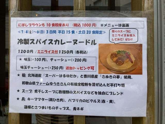 店前に貼られたメニューを確認すると、3日間限定ヒンヤリンコで冷たいのん!第5弾は、『冷製スパイスカレーヌードル』でございます。