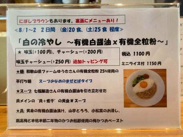 そして女将さんに《8/1~2 2日間 (金)20食、(土)25食限定》『白の冷やし~有機白醤油x有機全粒粉~ ミニライス付(1,150円)』×2を注文しました。