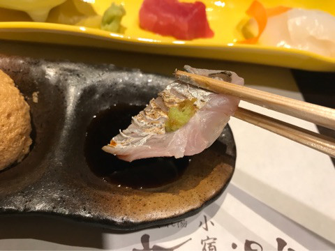 左から炙り太刀魚、真鯛、マグロ、紋甲イカで、手前の醤油は左がお店自家製の泡醤油で、右は普通の醤油(たぶん湯浅の醤油と信じよう)