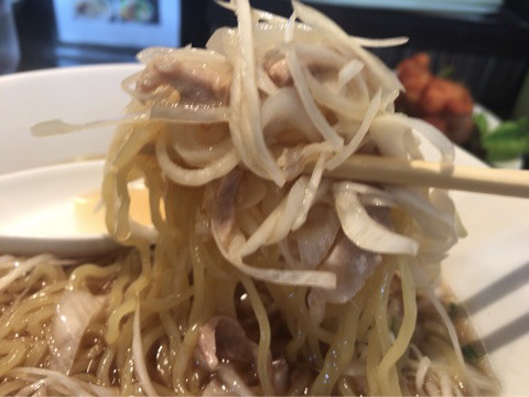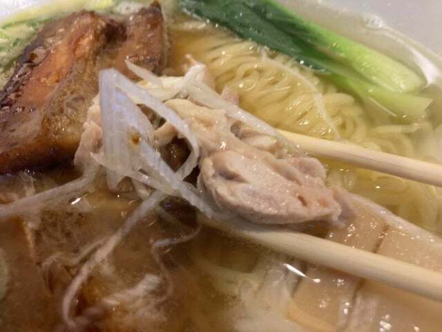 刻み鶏モモチャーシューと笹切り白ネギを一緒にスープに浸していただくと、鶏肉の旨みと熱でクタクタになったネギの風味が相性抜群で、これがスープと絡むと、めっちゃコク旨~!