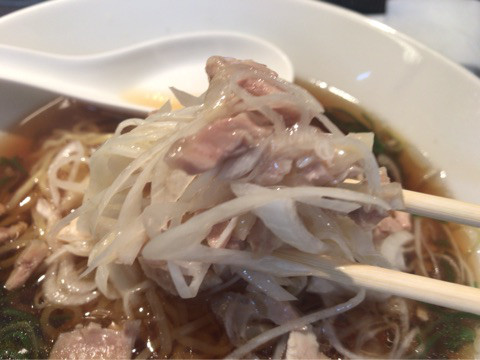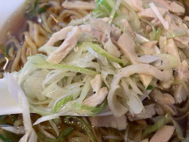 刻み鶏モモチャーシューと笹切り白ネギを一緒にスープに浸していただくと、鶏肉の旨みと白ネギの香ばしさが相性抜群で、めっちゃウマウマ~!