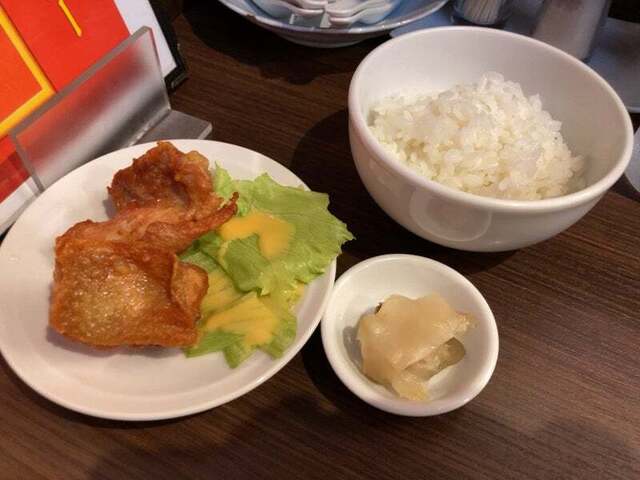 同時にセットの唐揚げは中ぐらいの大きさのが3つやってきました。これにご飯とザーサイがついて、お値段そのまま+150円ならかなりお得感があります。