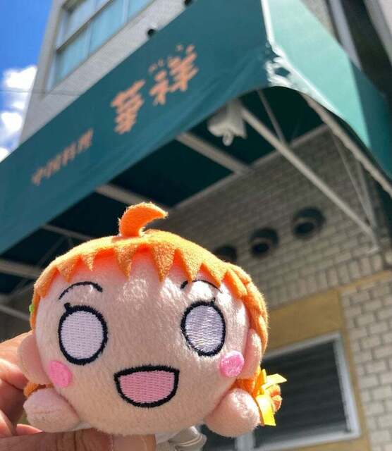 今日のお昼は、日傘さしながら徒歩にて田中里ノ前交差点にある人気店『中国料理華祥』へ、みかん大好き千歌ちゃん@Aqoursの寝そべりぬいぐるみとともにやってきました。