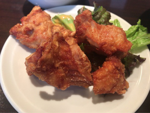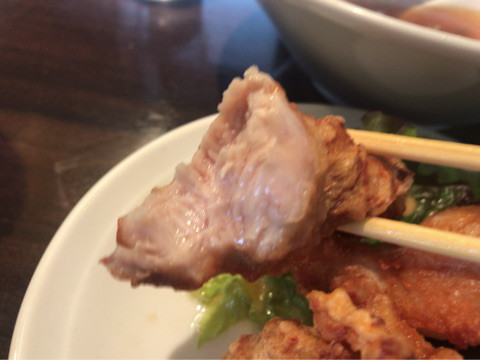 麺を食べ終えたら唐揚げを一口いただいてみると、外はカリッカリで、中身はジュ~シ~で、鶏肉の旨みとほどよい味付けが絶妙にマッチして、めっちゃウマウマ~!