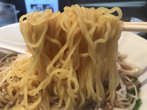 艶やかな麺肌のストレート細麺は、コシが強く弾力も十分で、プリップリの食感と麺肌の滑らかでツルツルッとした喉ごしの良さがなんとも心地よく、鶏清湯醤油スープと絡んで、すんご~く美味しい!