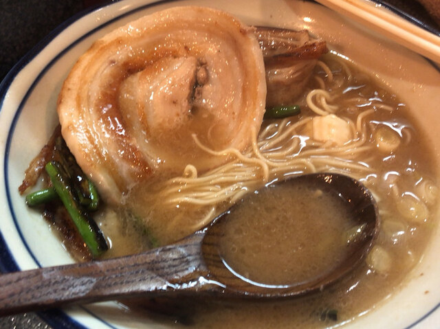 粘度のある濃厚スープやから、太めの麺かと思いきや、チャーシューの下から現れたのは、極細ストレート麺やった。