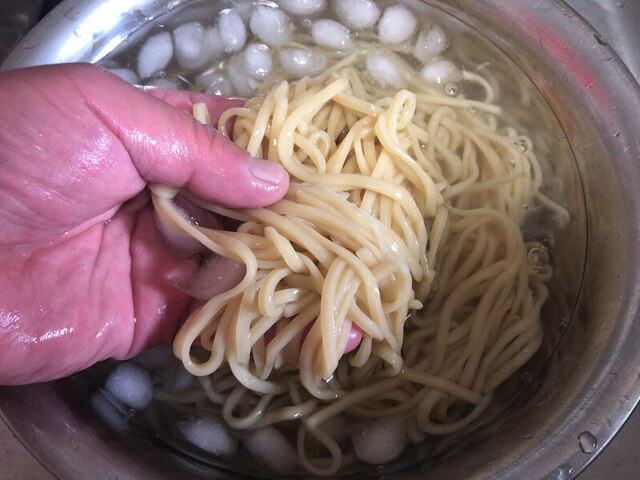 さらに氷水に麺を投入して、一気にヒンヤリンコに締めて出来上がり!