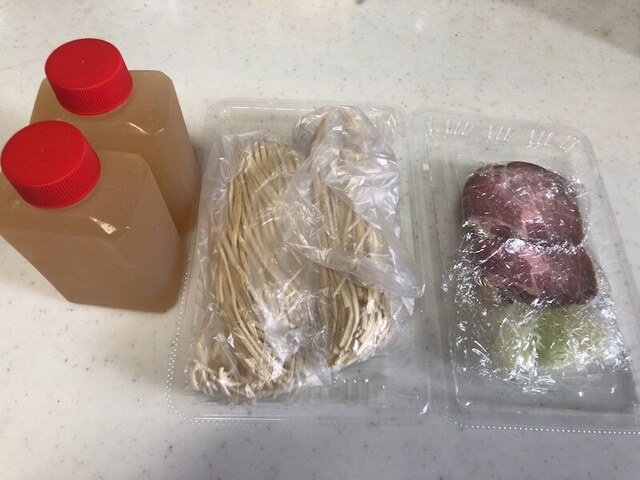 いつものようにすぐに食べられるというわけではなく、ラーメンの方は冷やしスープ、生麺、豚肩ロースレアチャーシュー、刻み白ネギが入っておりますので、これから調理開始~!