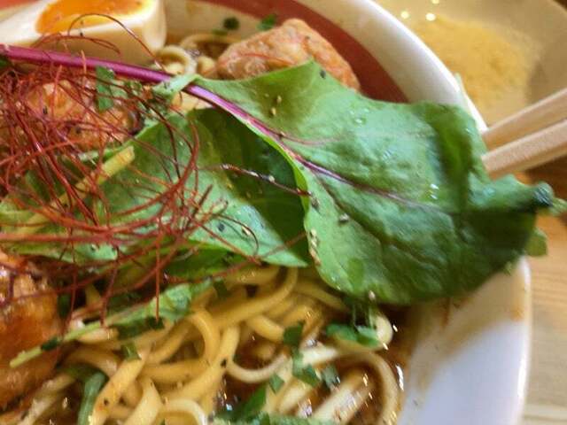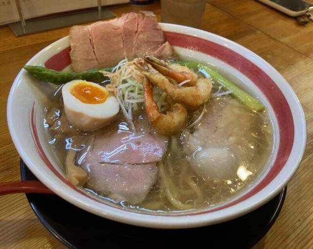 隣では嫁さん注文の『海老』がテーマの3月限定『バジル薫る海老塩らぁ麺』もやってきましたが、自分のラーメンに集中しすぎて、スープを一口もらうの忘れてた...