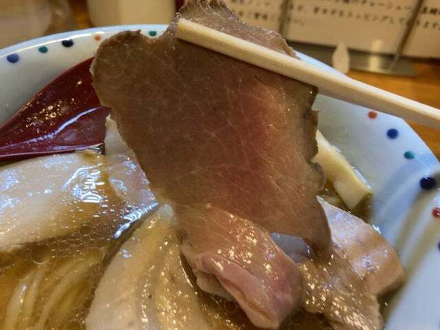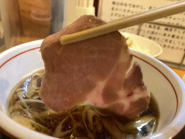 豚肩ロースチャーシューは、しっとり食感が心地よく、それでいて噛み応え十分で、噛めば噛むほど凝縮された肉の旨みが口の中いっぱいに溢れ出し、鶏魚介清湯醤油スープにしっかりなじませていただくと、めっちゃウマウマ~!