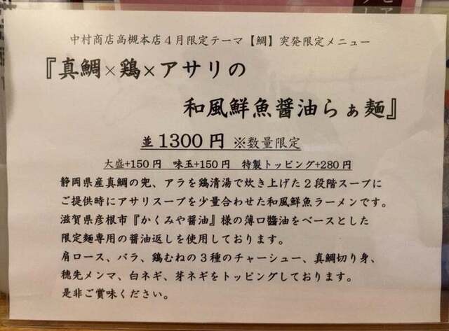 待っている間に今村店長からメニューを渡されたで、私は4/12(土)突発限定メニュー『真鯛×鶏×アサリの和風鮮魚醤油らぁ麺(1,300円)』を、嫁さんは『鯛』がテーマの4月限定『鯛煮干とアサリの洋風塩ラーメン~アクアパッツァ風~(1,100円)』を、“味付煮玉子(150円)”と“小ライス(150円)”×2とともに注文しました。