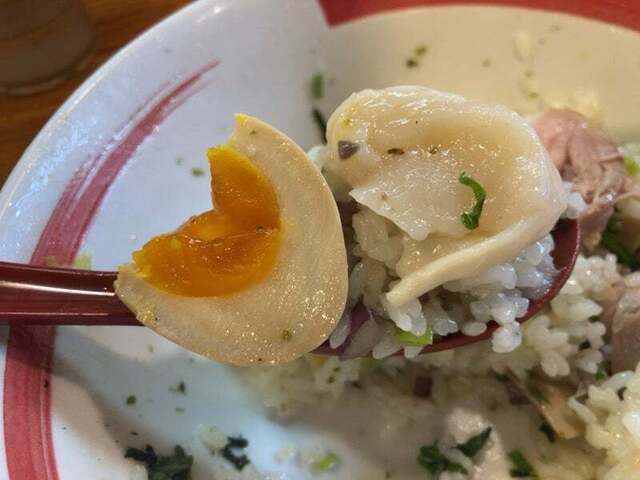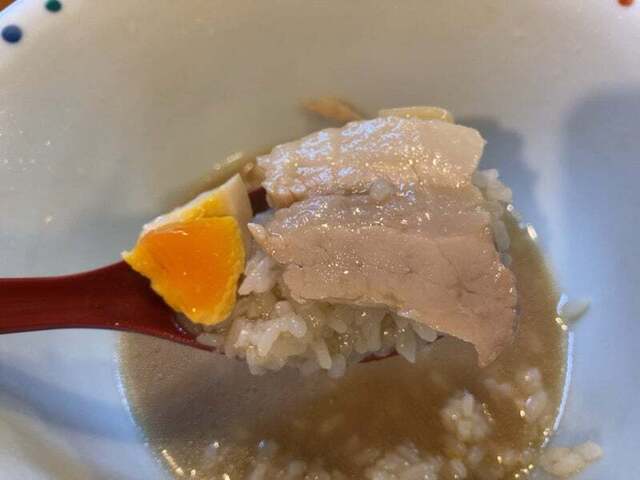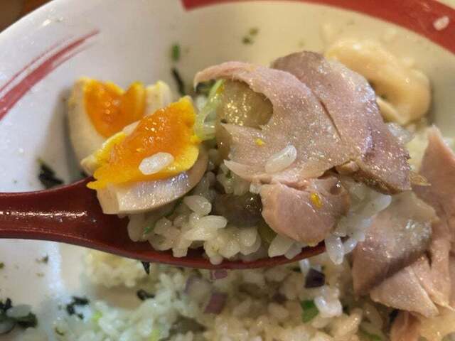 さっそく一口いただくと、鶏出汁と節系魚介出汁の風味と旨みをたっぷりと纏ったライスに、肉の旨みと脂身の甘み、マイルドな卵黄のコクが加わって、すご~く美味しい!