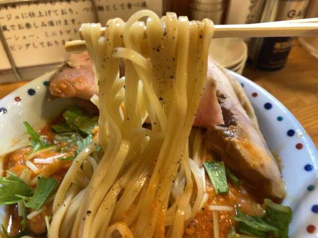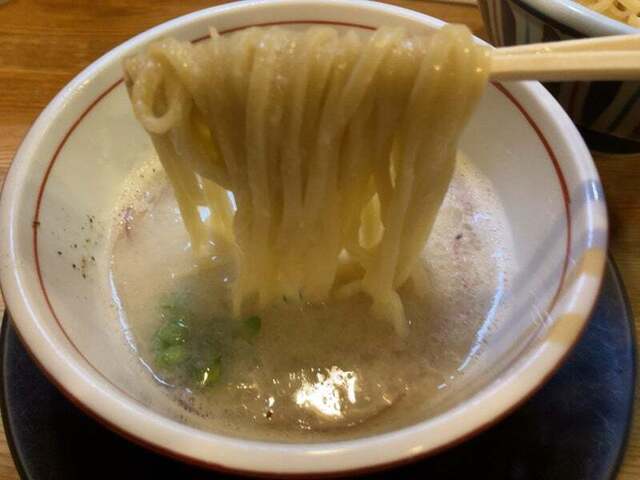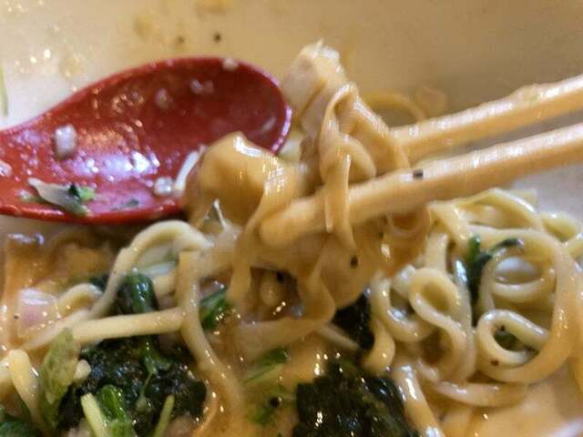 きんせいグループ専用粉“夢の風”を使用した自家製ストレート細麺は、小麦の風味豊かで、しなやかなコシに、プリップリの食感と麺肌滑らかでツルツルッとした喉ごしの良さが心地よく、ドロリンチョな鯵煮干し鶏白湯スープと絡みに絡んで、かな~り旨い!