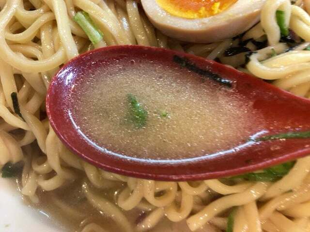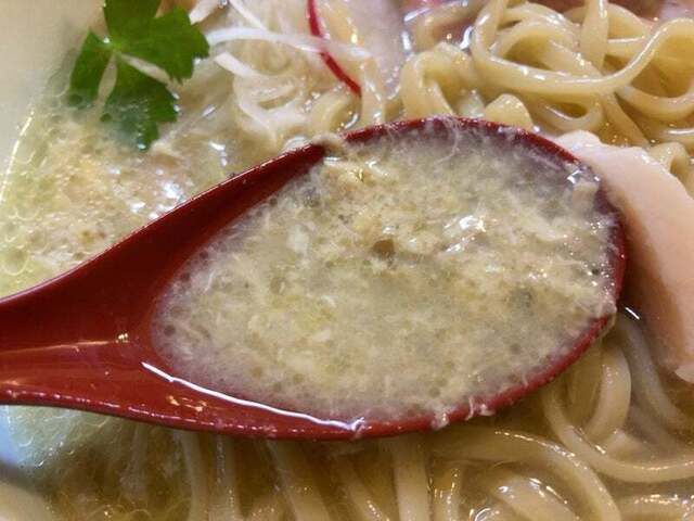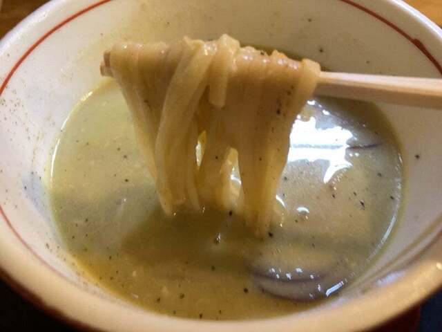 それではさっそくしっかりと乳化してアワアワ~な濃厚鯵煮干鶏白湯スープを一口いただくと...