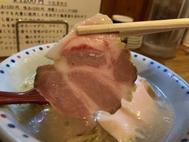 豚肩ロースチャーシューは、しっとり食感が心地よく、噛めば噛むほど凝縮された肉の旨みが口の中いっぱいに溢れ出し、鯵煮干鶏白湯スープにしっかりなじませていただくと、めっちゃウマウマ~!