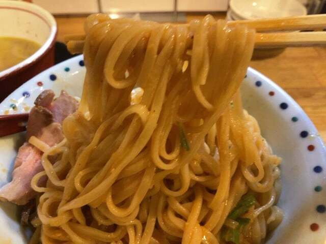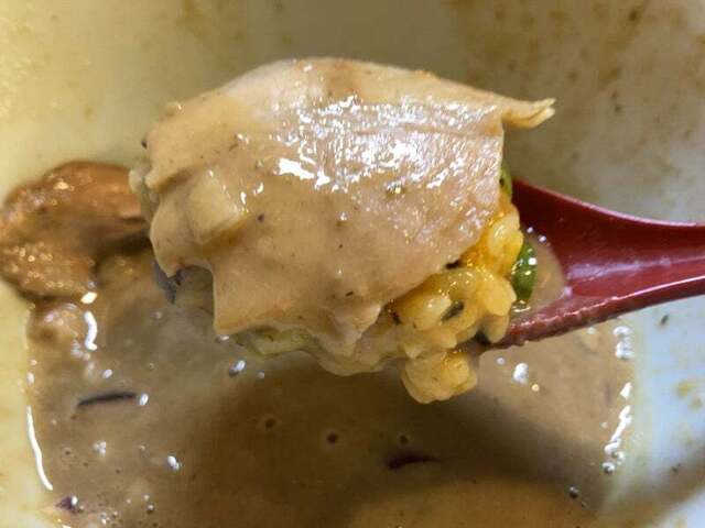 鯵煮干しと鶏出汁の芳醇な薫りが鼻を抜け、ドロリンチョな口当たりがなんとも心地よく、鶏出汁の風味と旨みが口の中に広がるとともに、鯵煮干し出汁の大人でビターな風味と濃厚な旨みが追随し、シャープでキレのある醤油(塩?)カエシのコクが加わって、ニッボニッボニ~ですご~く美味しい!
