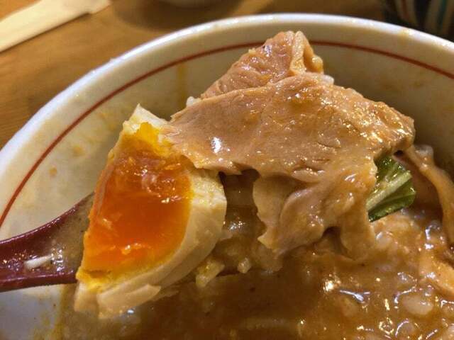 さっそく一口いただくと、海老・豚骨・味噌の風味と旨みをたっぷりと纏ったライスに、豚・鶏肉の旨み、海老の風味と旨み、黄身と卵黄の濃厚なコク、柚子七味の風味が加わって、すんご~く美味しい!