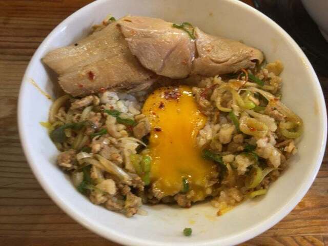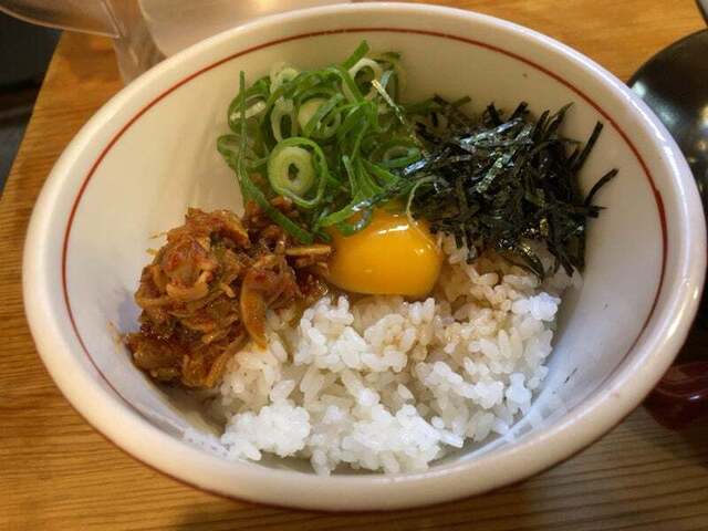 麺を食べ終えたら、『自家製食べるラー油の玉子かけご飯』を、お箸で卵黄を崩し、本日最初の“まぜまぜ~♪まぜまぜ~♪”の呪文を唱えてからいただくと、卵黄の濃厚なコク、自家製食べるラー油の風味と辛み、干し貝柱の旨み、刻み青ネギのザクザク食感、刻み海苔と魚粉の風味が相性抜群で、ご飯が進む!進む!