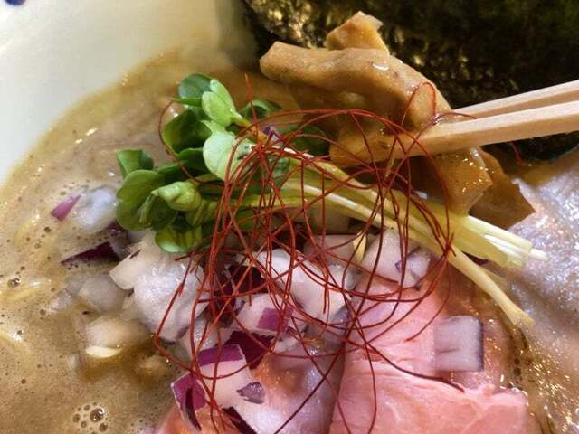 しばらくして、しっかりと乳化してアワアワ~な濃厚鯵煮干鶏白湯スープの上に、豚肩ロースチャーシュー、豚バラチャーシュー、メンマ、カイワレ、粗みじんアーリーレッド、海苔、糸唐辛子がトッピングされた11/29突発限定『氷見産鯵煮干しの濃厚煮干鶏白湯ラーメン(1,200円)』が、鯵煮干しと鶏出汁の食欲そそる濃厚で芳醇な薫りを漂わせてやってきました。