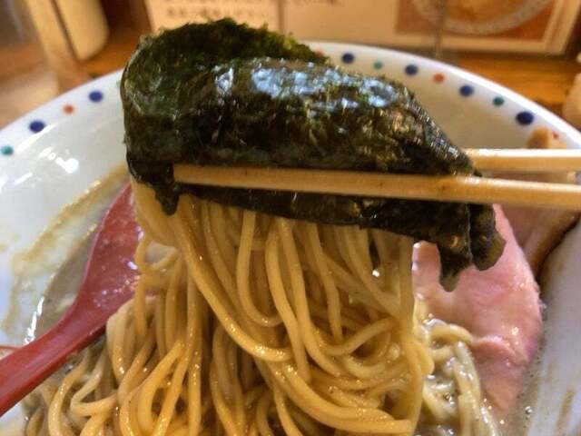 さらに麺を海苔で巻いてスープにくぐらせていただくと、海苔の風味が鯵煮干し&鶏出汁と相性抜群で、めっちゃウマウマ~!