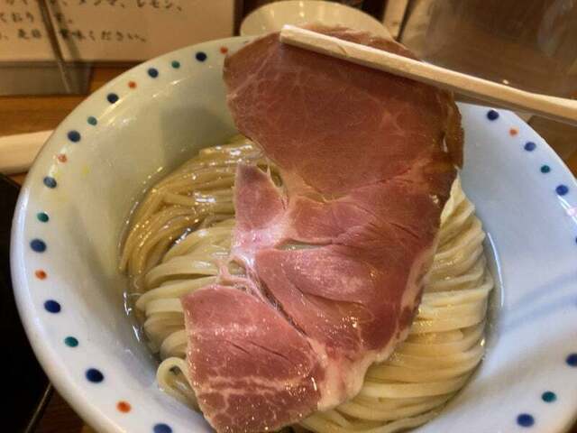 豚肩ロースチャーシューは、しっとり柔らか食感が心地よく、それでいて噛み応え十分で、噛めば噛むほど凝縮された肉の旨みが口の中いっぱいに溢れ出し、鶏貝出汁塩つけ汁にしっかりなじませていただくと、めっちゃウマウマ~!