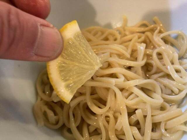 さらに麺の上にスレモンを搾ってから、つけ汁に投入していただくと、レモンの酸味が加わることで、めっちゃ爽やか~!