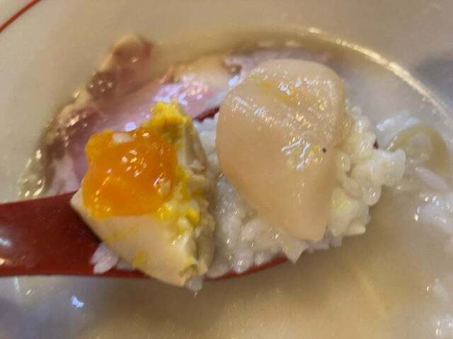 一口いただいてみると、鶏出汁・貝出汁・干し貝柱・昆布出汁の風味・旨み・甘みをたっぷりと纏ったライスに、帆立マリネの旨み、肉の旨みと脂身の甘み、マイルドな卵黄のコクが加わって、すんげぇ~旨いっ!