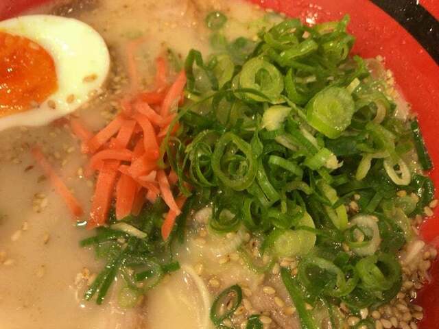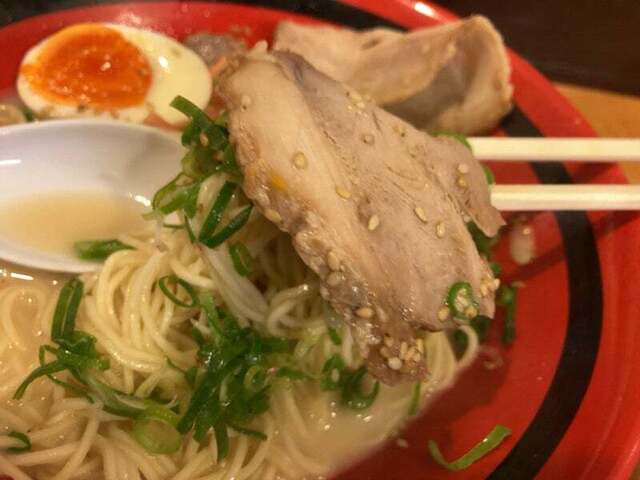 しばらくして、しっかりと乳化した豚骨スープの上に、脂身多めで厚めの豚肩ロースチャーシュー、ゆで卵、刻み青ネギ、紅ショウガ、白ゴマがトッピングされた『とんこつラーメン』が、なんとも食欲そそる豚骨出汁の香りを漂わせながらやってきました。