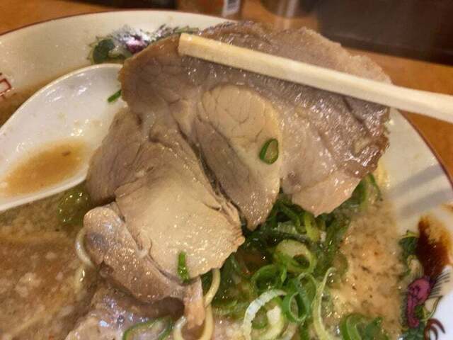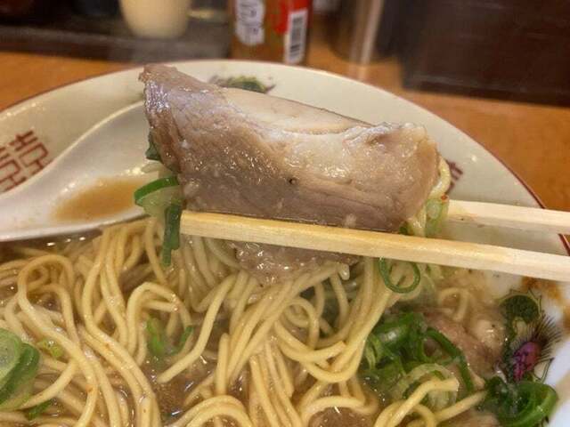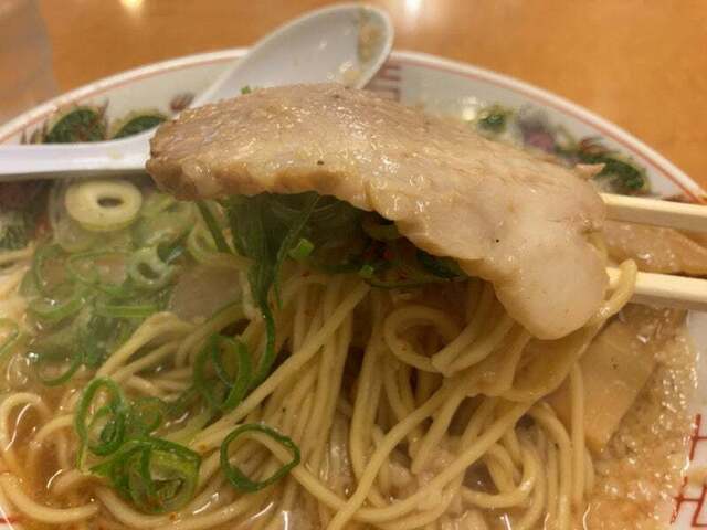 やっぱりこのスープにはかために茹でてもらったストレート細麺が一番合いますね。歯ごたえもよく、スープとの絡みも抜群で、スルスルっと口の中に入ってきます。トッピングの大ぶりチャーシュー2枚は、厚さもそこそこあるので、食べごたえ十分です。味付けもしっかりしてて、ホロホロっと崩れるような食感もよく、めちゃめちゃ美味しいです。