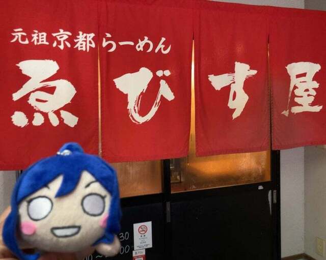というわけで、ここでも放心状態が上乗せされつつ、職場へ戻る傍ら猛暑やけど“京都背脂チャッチャ”が恋しく♥なって、「元祖京都らーめんゑびす屋」へ、鞠莉ちゃん@Aqoursの寝そべりぬいぐるみとともにやってきました。