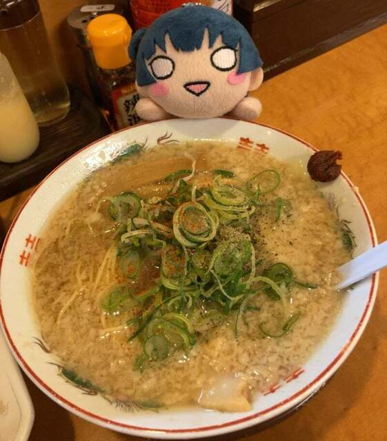今日のお昼は、いつもの“京都背脂チャッチャ”ではなく、なんとなく博多長浜豚骨系が食べたくなって、「元祖京都らーめんゑびす屋」へ、果南ちゃん@Aqoursの寝そべりぬいぐるみとともにやってきました。