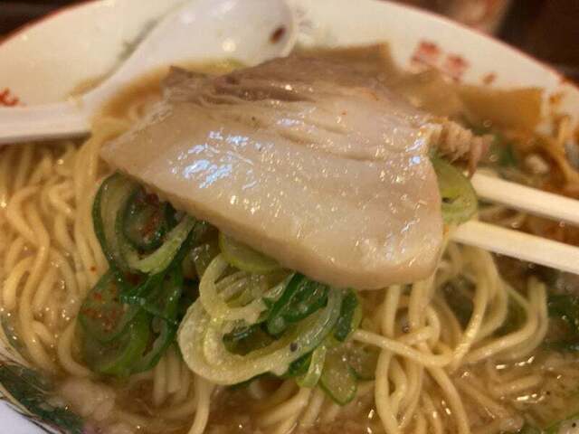 背脂が浮いた鶏ガラ醤油スープを一口いただくと、最初に若干鶏ガラの獣臭は感じるものの、それも旨みの一つと思えるほどで、しっかりとした鶏がらの出汁と醤油ダレの風味と旨みが口の中いっぱいに広がります。さらに背脂のコクと甘みがプラスされ、相変わらずめちゃめちゃ美味しい!京都の老舗「麺屋棣鄂(ていがく)」のストレート細麺は、カタメでお願いしたので、小麦の風味を感じつつ、パツンとした歯ごたえが心地よく、スープとの相性も抜群でたまらない旨さ!相変わらず大ぶりな豚チャーシューは、スープ表面を完全に覆い隠してしまうほどで、ホロホロっと崩れるほどの柔らさ、味付けもよく、麺と青ネギとともにしっかりスープと絡めていただくと、なんとも旨い!