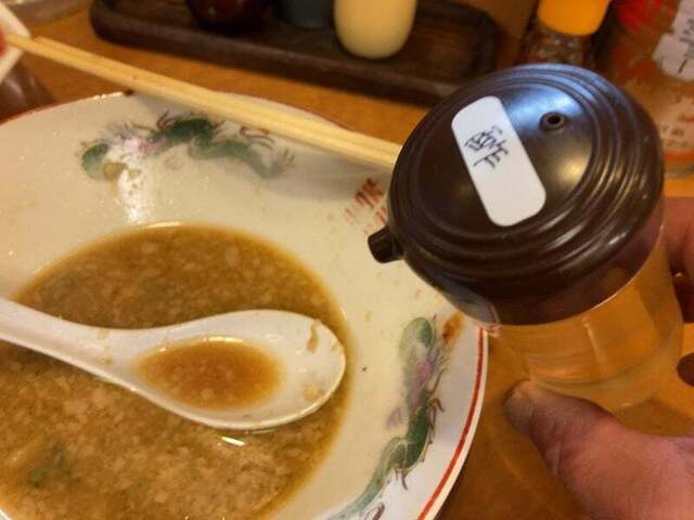 残ったスープには、定番のお酢をちょこっと入れると、背脂の脂っぽさも消えてさっぱりするので、最後まで美味しく飲み干せてしまいますよ。