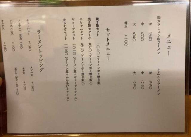 基本のメニューは、「鶏ガラしょうゆ」と「とんこつ」の2種類です。あとはセットメニューで、「焼めし」、「餃子」、「唐揚」と定番どころがそろってます。初めてでしたので、「鶏ガラしょうゆ」の「焼めし」で注文しました(850円)。50円UPで、焼めし(小)が(並)になるので、お得かなって思って注文しました。