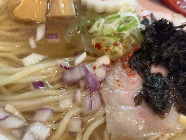 しばらくして、透き通った魚介塩スープの上に、豚ロースチャーシュー、極太メンマ、刻み白ネギ、粗みじん紫タマネギ、ナルト、黒バラ海苔がトッピングされた『魚介しお』が、なんとも優しい魚介出汁の薫りを漂わせてやってきました。