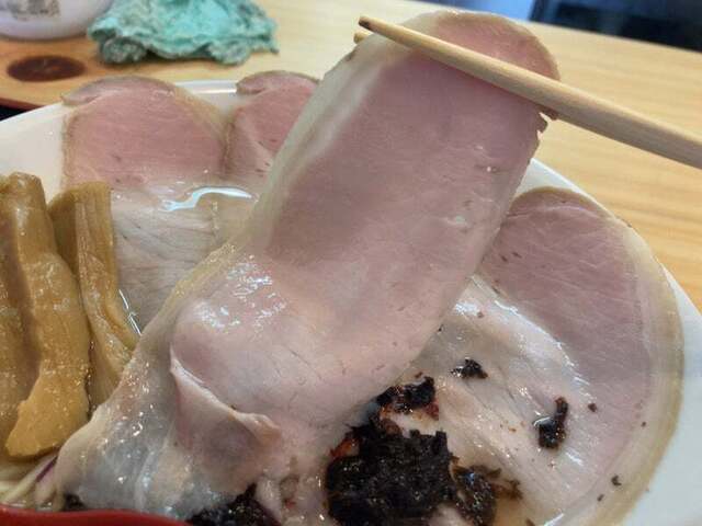 豚肩ロースチャーシューは、生ハムのようなしっとり食感が心地よく、噛めば噛むほど凝縮された肉の旨みと甘みが口の中いっぱいに溢れ出し、魚介塩スープとよくなじんで、めっちゃウマウマ~!