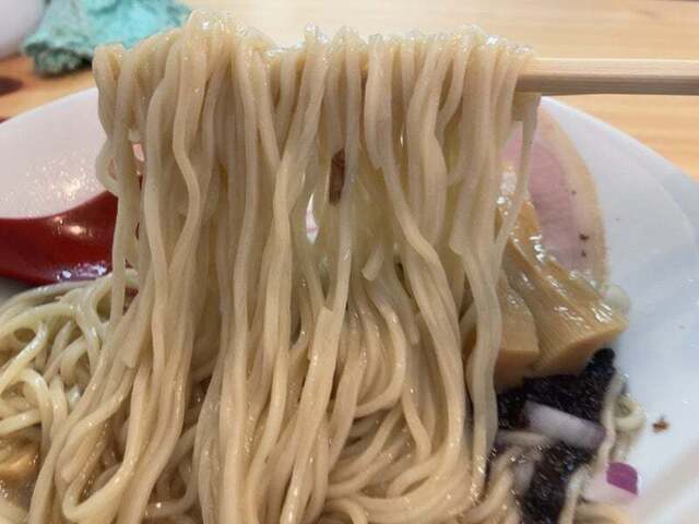 ストレート細麺は、小麦の風味豊かで、しなやかなコシに、プリップリの食感、シコシコッとした歯切れの良さ、麵肌滑らかでツルツルッとした喉ごしの良さがなんとも心地よく、魚介塩スープと絡みに絡んで、かな~り旨いっ!