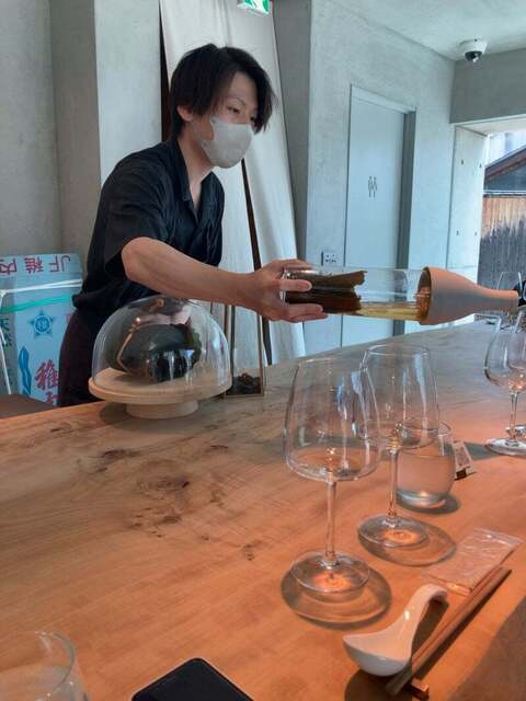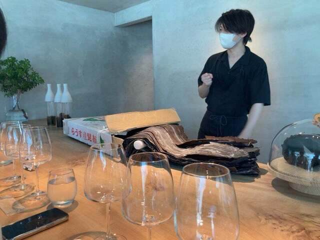 続いて目の前の3つのワイングラスに、左から羅臼昆布、真昆布、利尻昆布の順に水出し昆布出汁が注がれますので、まずは香りを楽しんだ後にテイスティングすると、説明されたそれぞれの特徴がよくわかります。