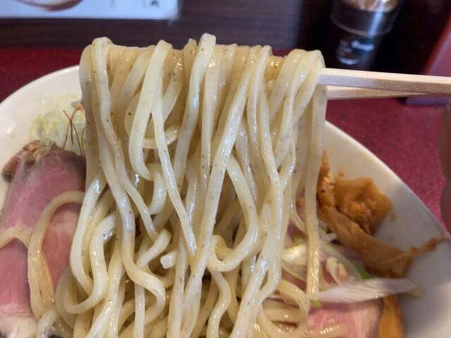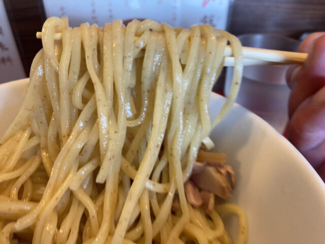 エッジの効いた自家製中太ストレート麺は、小麦の風味豊かで、しなやかなコシに、多加水率が織りなすモッチモチの食感と麺肌滑らかでツルツルッとした喉ごしの良さがなんとも心地よく、アオサ海苔・魚粉・ニンニクの芳醇な薫りを纏った醤油ダレと絡みに絡んで、すご~く美味しい!