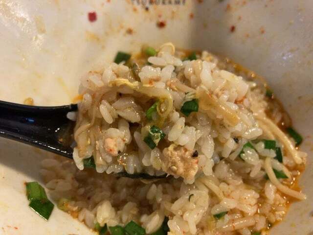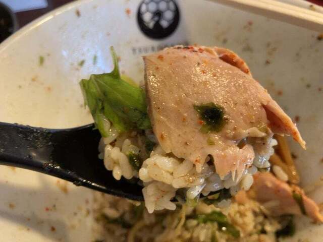 さっそく一口いただいてみると、カレー担々つけ汁と節系魚介出汁の風味と旨みをたっぷりと纏ったライスに、肉の旨み、味変調味料の風味が加わって、超絶やばウマ~!