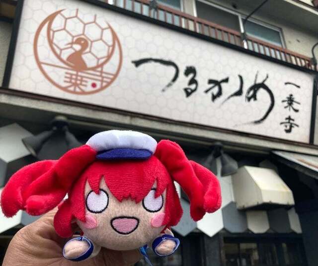 というわけで、今日のお昼は、雨&雪が降る中チビヨハちゃんに乗って、京都ラーメンの聖地“一乗寺”にある人気店「つるかめ一乗寺」へ、果南ちゃん@Aqoursの寝そべりぬいぐるみとともにやってきました。